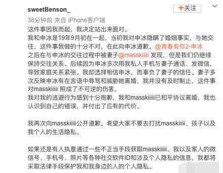 此前,有网友爆料称申冰插足自己的婚姻,并借用男方手机恐吓自己,随后该事件男方微博发文承认了该事实。