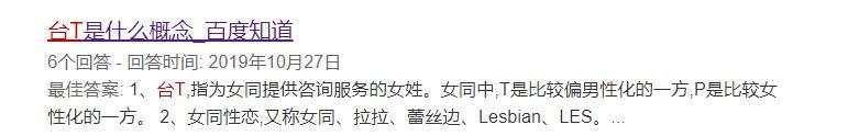 在网上搜索“台T”,有网友解释是指为女同提供咨询服务的女性,这个瓜有点大。