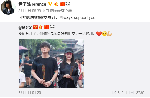 而且徐冬冬在曾经的采访中就已经透露,未来能不能与尹子维的感情延续还得看缘分。他们分手的时候,其实依旧在同一剧组拍戏,官宣分手那天两个人晒出的照片就是在剧组拍摄,所以拥有感情基础的他们,继续碰撞出爱火也是可以理解的。
