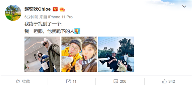 三月二十五日,被称为宅男女神的演员赵奕欢在社交软件上突然官宣恋情,大胆示爱表示对方是那个“我一瞪眼,他就跪下。”的那个人。赵奕欢更是晒出了自己与男友的合照,照片中的赵奕欢跟着男友一起搞怪,笑得十分灿烂,两人的感情的确很好。