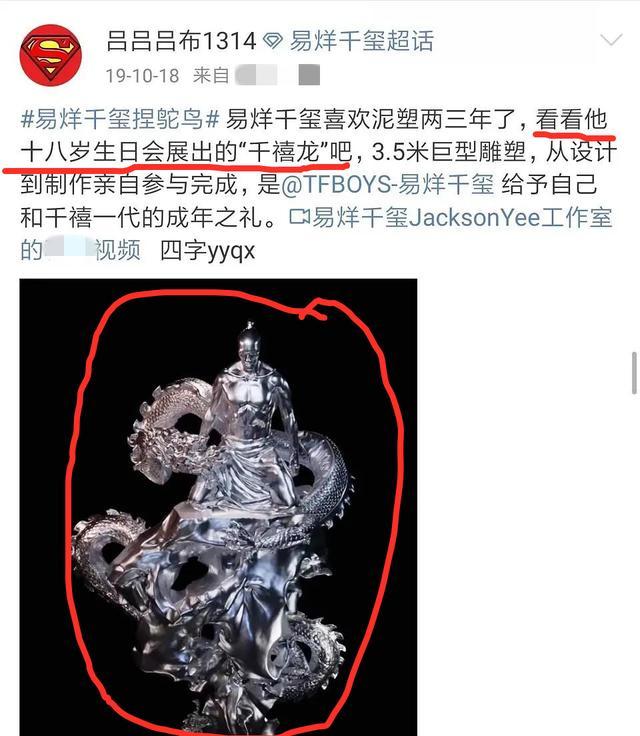 其一,泥塑。朋友圈中有一段2018年11月29号发布的泥塑视频,该泥塑从外形上看与易烊千玺18岁生日会上展出的“千禧龙”极其相像。