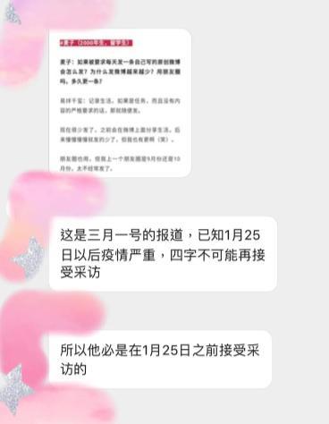 根据网友分析由于1月25号后疫情严重,所以易烊千玺不可能接受采访,那么这段采访的实际时间应在1月25号之前,而这又与朋友圈动态的发布时间对上了。