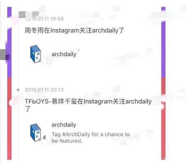 除此之外,去年7月11日时,周冬雨在社交媒体上关注了一位建筑师。而时隔不到二十分钟后,易烊千玺也紧接着关注了该建筑师。