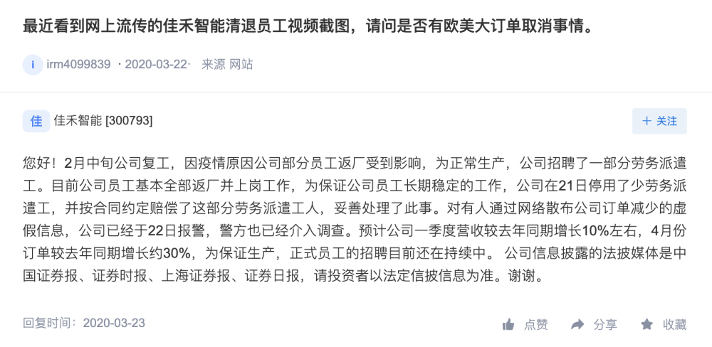 佳禾智能的回应显示,该公司2月处在复工初期,为了正常生产而招聘了部分劳务派遣工,由于目前正职员工基本返厂工作,因而停用了少量劳务派遣工并且依合同给予赔偿。该公司预计一季度营收较去年同期增长10%左右,4月份订单较去年同期增长约30%,为保证生产,正式员工的招聘目前还在持续中。