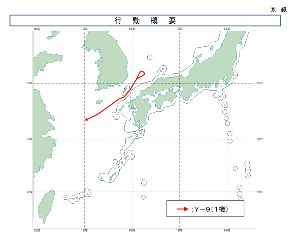 日本统合幕僚监部公开的资料称,这架中国海军飞机为一架”运-9情报收集机”,飞行路线图显示,这架中国军机经对马海峡从东海进入日本海空域,在日本海空域盘旋后,再次经对马海峡返回东海空域。