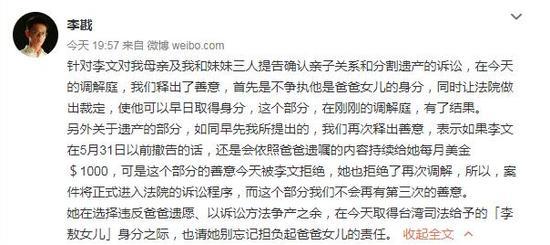 很快,李戡就对此做出回应,说要是李文能撤告的话,他还是会按照父亲生前的遗嘱每月给她1000美元的生活费,要是她执意要上法庭的话,他也定当维护自己的合法权益,据理力争,停止支付李文的生活费,同时也希望她取得台湾司法给予的‘李敖女儿’身份之际,也别忘了担负起爸爸女儿的责任。