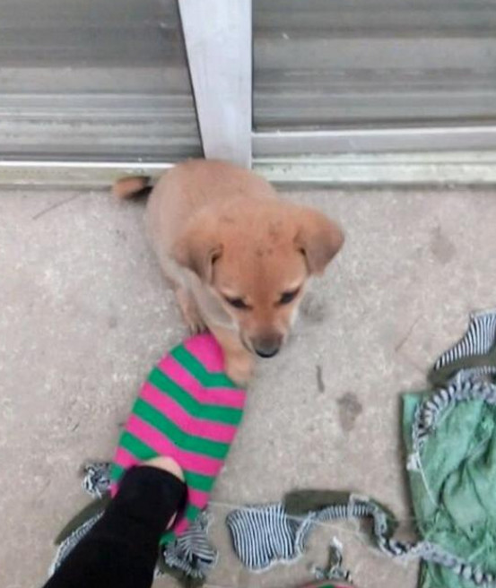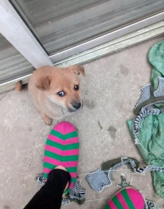 狗狗啊,这可是我刚买不久的衣服啊,我明明搭在沙发较高处了,老实交代你这二货是怎么把衣服弄下来还咬了个稀巴烂的,信不信我把你卖了拿钱去买衣服,不要试图逃避,看着我的眼睛。
