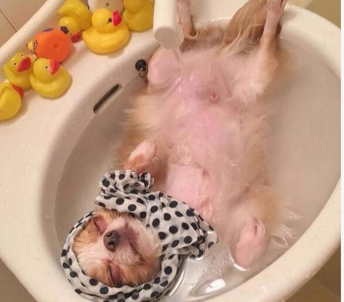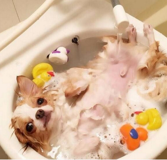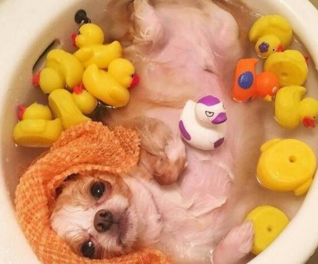 但是,对于给狗狗洗澡这事,也有例外,比如今天我们要一起看的这只狗狗。这只狗狗主人给它洗澡它不但不反抗,而且还很配合,乖乖的躺在浴盆里,也不乱动,两只大眼睛看着主人,仿佛在等待着主人夸它乖。当然童心未泯的主人不单单给狗狗用了洗澡专门用的东西,还在狗狗的浴盆了放了许多小黄鸭,就是给小孩子洗澡的时候给小孩子在水里玩的那种小黄鸭,可见主人真的是把这只小狗狗当孩子看待了。