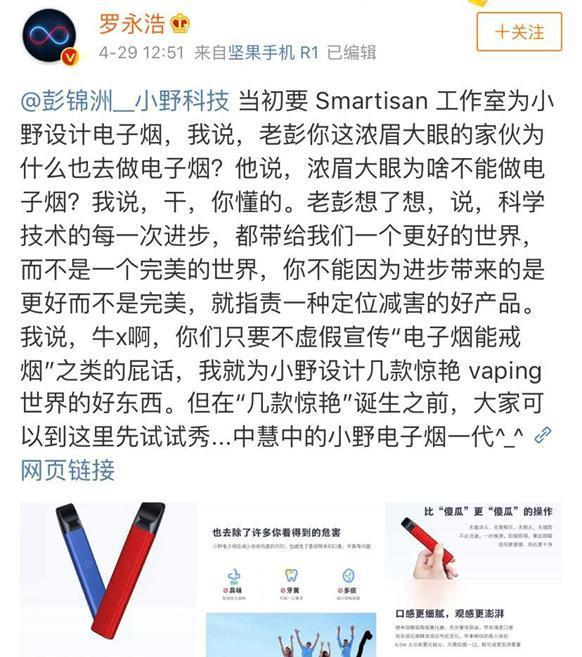 2019年4月29日,罗永浩在微博上宣布小野电子烟一代发售,并且称京东上可以购买。此外,罗在留言中还预示,自己将来要亲自参与小野电子烟的设计工作。