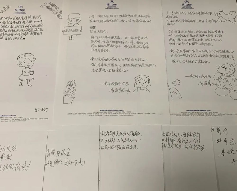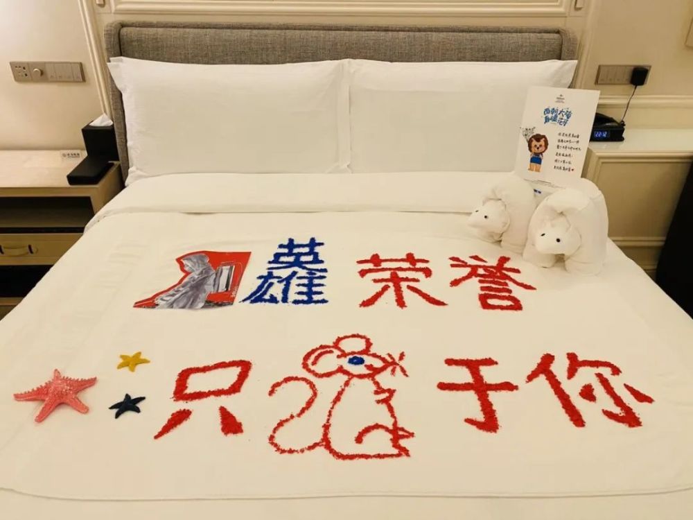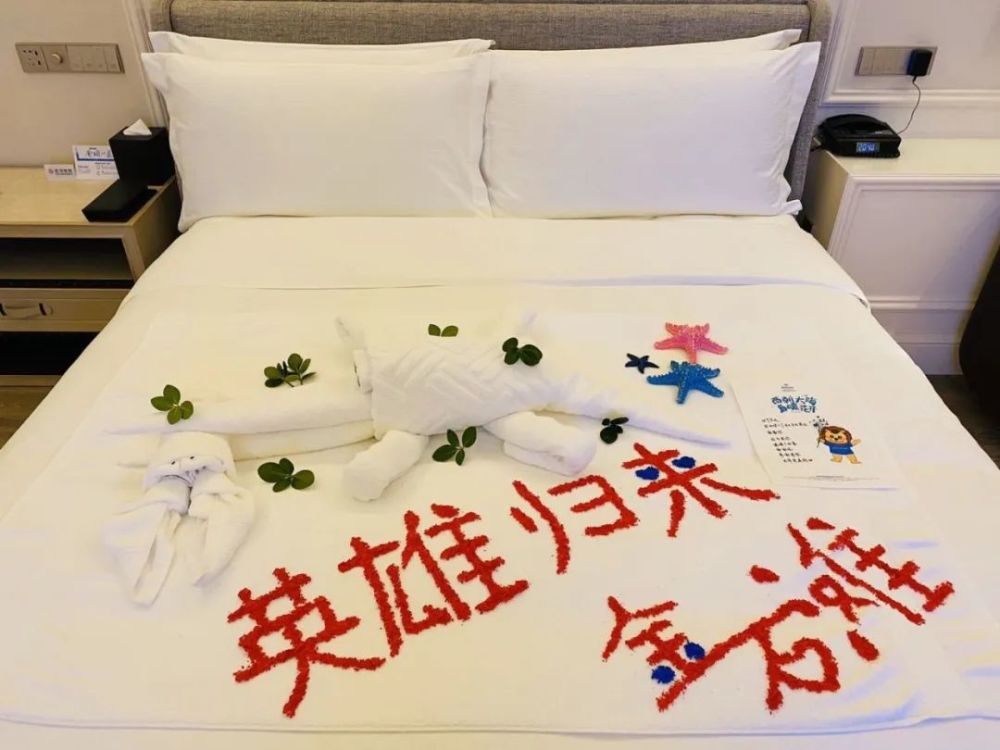 酒店随处可见的欢迎语也是包含了我们对他们的感谢,房间里欢迎页都是为每一位医护人员量身定做的。酒店布置上,我们准备了特色的欢迎仪式,大堂条幅、电梯海报、展架等,让他们每一步都能感受到我们对他们感谢的心意,甚至每天透过窗户,映入眼帘的都是暖心的话语。我们还每天都准备了小惊喜,让他们每天都有不一样的体验。