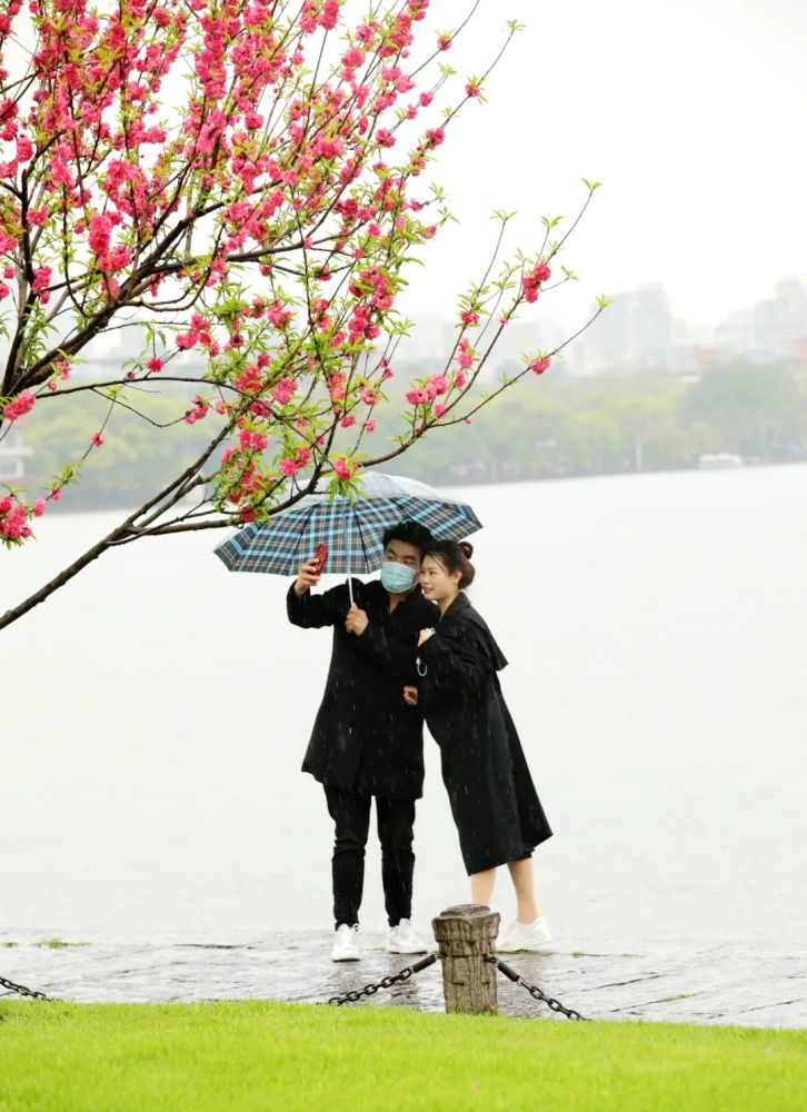 还是有游客冒雨前来赏花拍照