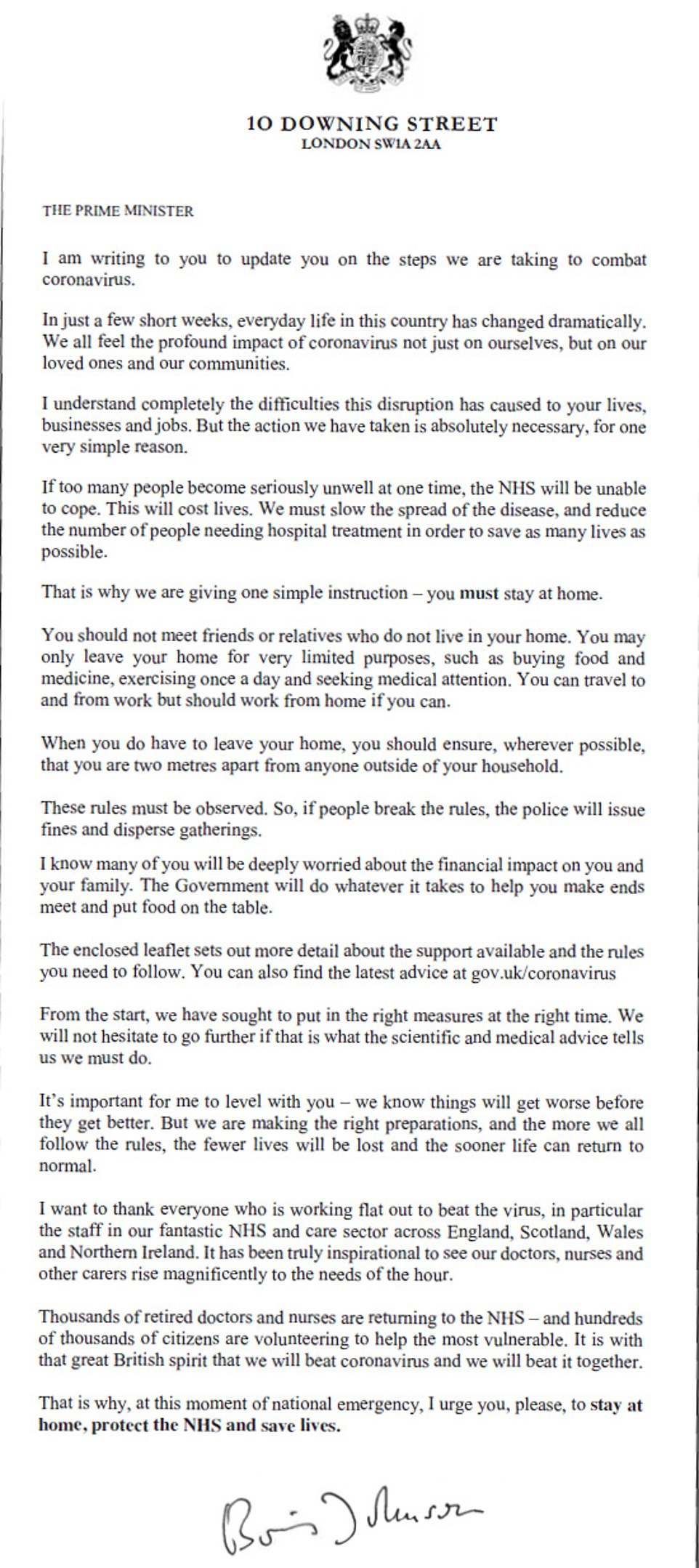 “我们正在做恰当的准备,我们越是遵守指令,就越少人丧生,生活将越快恢复正常。”约翰逊在信中写到,“在此国家危难之时,我敦促你们,请呆在家,保护NHS,拯救生命。”