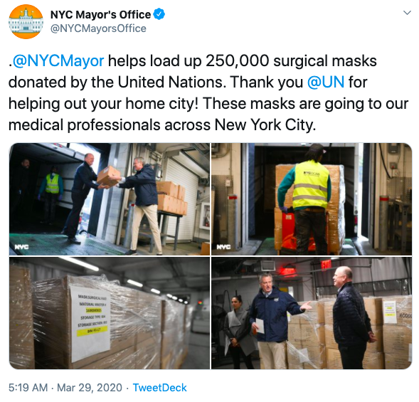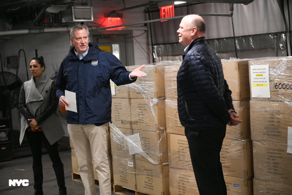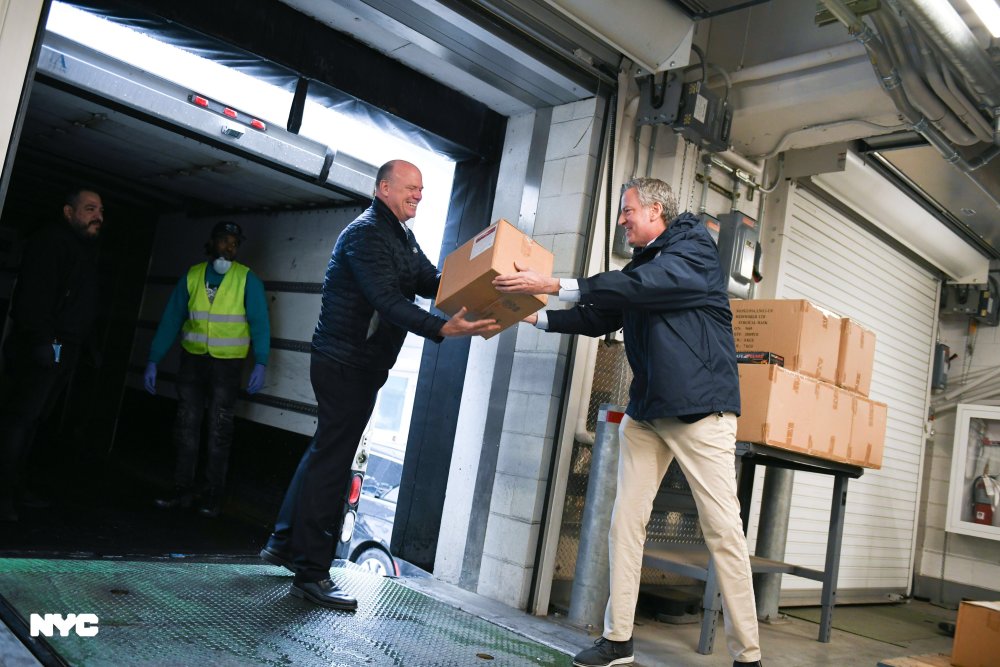 据《纽约邮报》3月28日报道,纽约市长白思豪(Bill de Blasio)亲临装货现场指导工作,他还帮助工人们将一箱箱的口罩运上卡车。