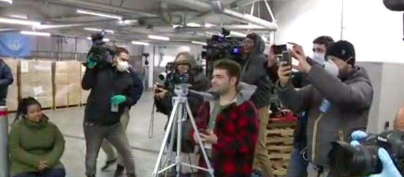 身后堆着一箱箱口罩,白思豪抬起一箱,将其递给卡车旁的工人。现场有多台记者和摄影机,当焦点对准他时,他面带微笑,一边运货,一边还和现场的记者们谈笑风生。