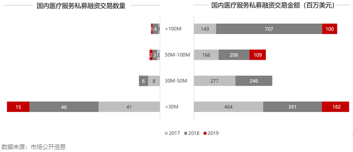 医疗服务私募融资继2018年下半年走低之后,在2019年再创新低,交易数量和金额都有收缩。