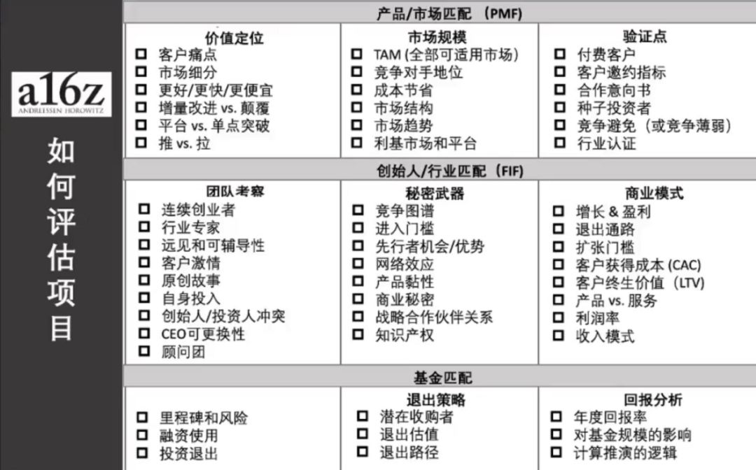 那VC是怎么来评估项目的呢?上面是a16z用来评估项目的一个表,这个表中的每一条都可以衍生出一些问题。第一块就是产品和市场的匹配,就是product/market fit。你的产品的价值定位,是不是找到了客户痛点,你需要在哪个市场细分,你的技术是增量改进的、还是颠覆的,你能为客户创造什么样的价值,你的商业模式是平台性的还是单点突破的等等。这里每一项都会有一个量化的打分。