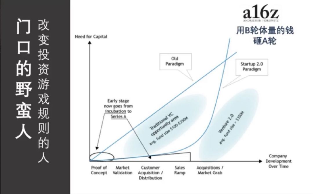 以前项目融资可以一直到B轮,才把商业模式的真正价值跑出来。但今天,按照a16z的玩法,一定要在A轮前,你就要把商业模式验证出来,然后才能借助一笔大的投资加速产品到市场的曲线,这样的话,传统VC的游戏空间就需要往左移了,加入到早起孵化器和种子基金那拥挤不堪的混乱阵营里。这会对只有赛道判断能力,而不是项目辅导能力的普通VC造成很大不适应性。