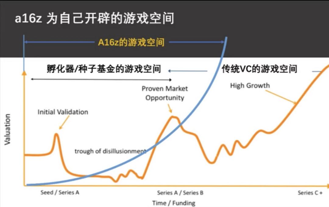 原来的一条连续的,线性的投资成长模型,变成了用小种子投资探路再突然放一个大A轮投资的加速曲线。a16z的模式对现有的VC构成了一个降维的打击。原来投B轮的没有B轮了,因为被a16z截胡了,按a16z的曲线成长的项目后面的估值传统的B轮基金也投不起了。而传统上投A轮的基金,就更投不了了,因为基金的规模简直没办法跟a16z抢项目。a16z把整个原来的创业项目成长的曲线整体往前移了,它利用其强大的投后管理,提升了整个项目的投后估值和成长速度,从而能够更快上市。这个模式是a16z对传统线性思维的VC的颠覆。