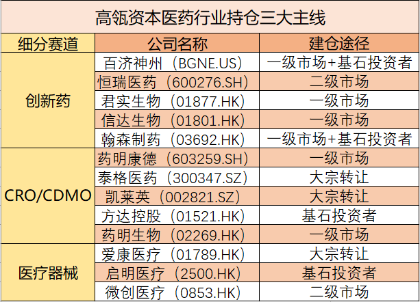 高瓴资本在医药赛道的投资方式比较灵活,从一级市场到二级市场都有所涉足。在持仓分布上,包括以下三大主线。