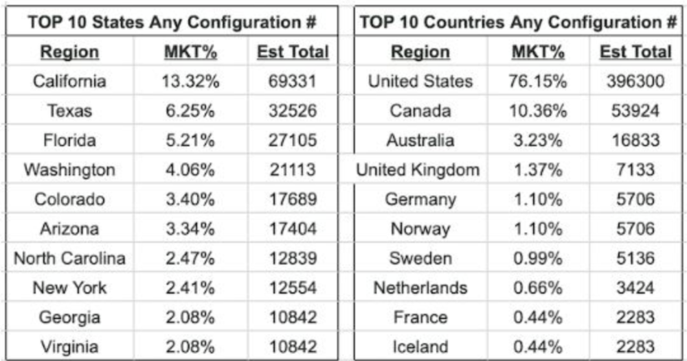 从订单明细来看,全球62.2万辆订单中,来自美国的订单为39.6万辆,占比达到76%;第二名加大拿仅5.39万辆,占比10%,其他国家或地区相对较少。在美国分州的排名中,加利佛尼亚州历来都在特斯拉新车预订用户排名第一,这次也不出意外,拥有6.9万辆订单,占比达到13%。