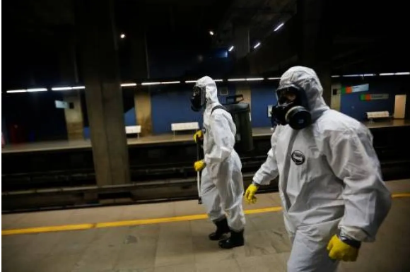 3月29日,在巴西首都巴西利亚,防疫人员在地铁站进行消毒作业。新华社/路透