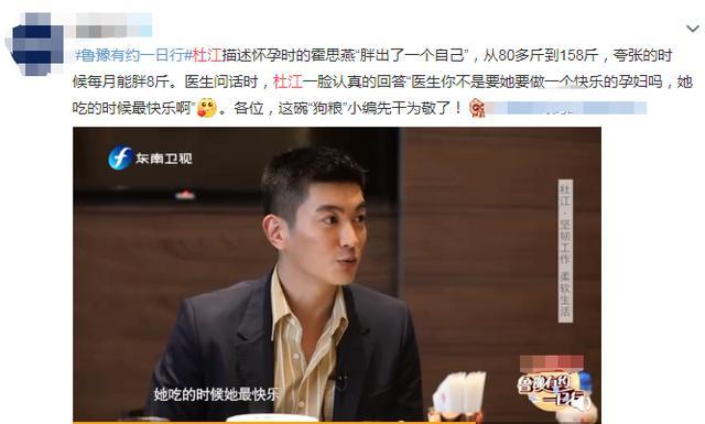 谈到当初怀孕时的事,杜江还说霍思燕那时候真的超能胖,严重时甚至一个月就能胖8斤。怀孕时孕妈妈可能都被要求过控制体重,杜江还曾因此为了妻子反问医生“医生你不是要她要做一个快乐的孕妇吗,她吃的时候最快乐啊”。
