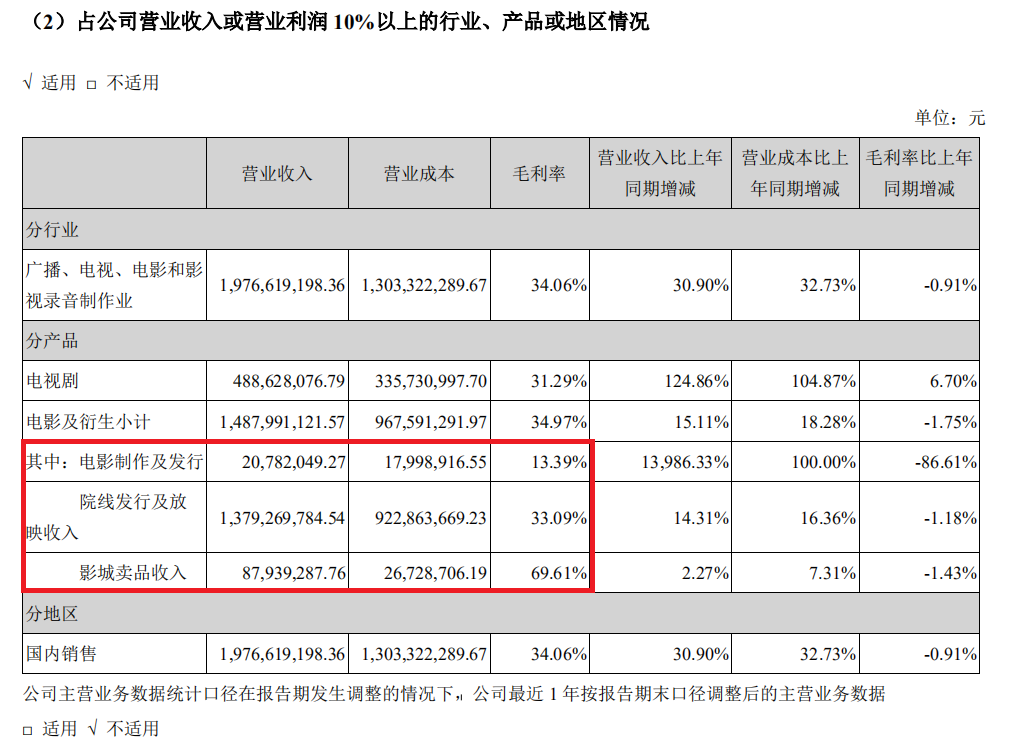 作为背靠江苏广电的院线股,幸福蓝海2019年电影业务实现收入16.49亿元,电视剧业务实现收入4.89亿元。占据收入大头的电影业务主要包括电影制作发行、院线发行及放映、影城卖品收入三部分。值得注意的是,2019年财报数据显示,这三部分的收入分别为2078万元、13.79亿元、8793万元。
