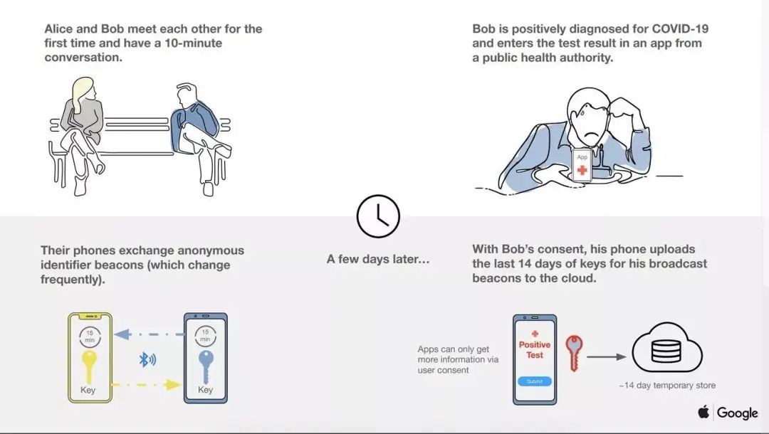 苹果和 Google 提出的这个方案,依靠手机蓝牙无线广播技术,让每一部手机都记录本机附近曾经过的手机。