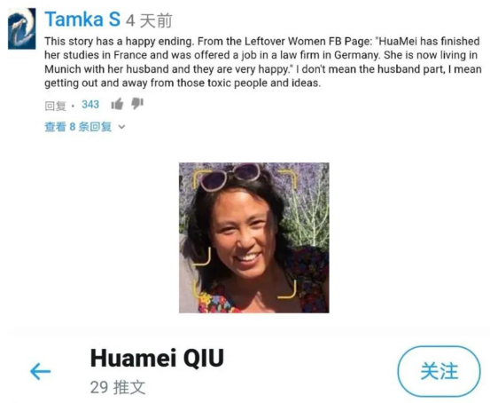 她在德国毕业后,留在德国一家律所工作。和一位德国人恋爱结婚,两个人过着幸福甜蜜的生活。 华梅自己也在社交网络上发布了自己的状态,她的头型与装束已和过去不同。