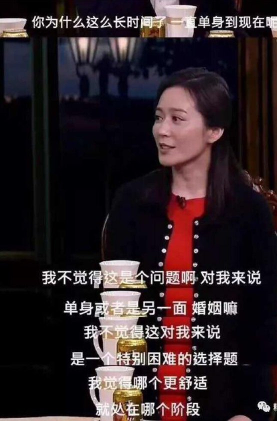 在与窦文涛、许知远等人面对面的访谈中,当提及很多人所好奇她的婚姻状况,她说: “我不觉得这是个问题啊,对我来说,单身或是进入婚姻,并不是一个特别难的选择题,我觉得哪个更舒适,就处在哪个阶段。”
