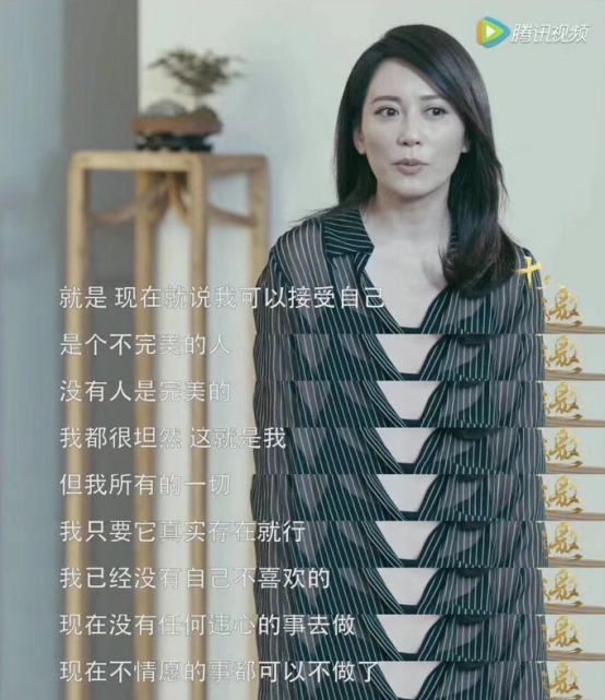 我指的做主不是说在某件事里头,而是说在自己的精神状态里头,在自己的世界里,完全是自己的主人的那种感受。 三十多岁以后到现在,知道自己喜欢什么适合什么,这毕竟需要一个过程吧。” “现在,我可以接受自己是个不完美的人。我很坦然,这就是我,我所有的一切,我只要它真实存在就行。