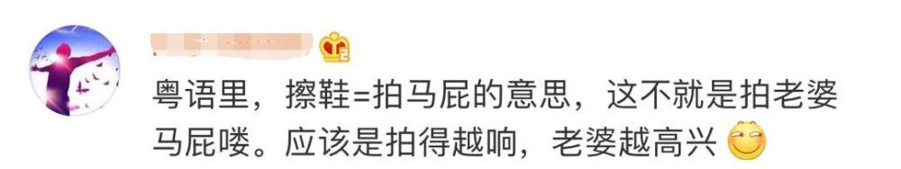 也有网友调侃道:“在粤语里,擦鞋是拍马屁的意思‘’,暗示涂磊是在拍妻子的马屁,化身“妻奴”。