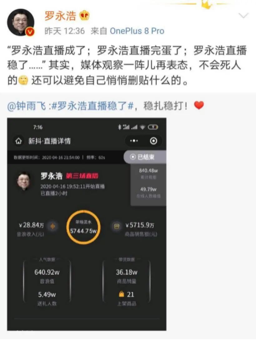 “罗永浩直播成了”“罗永浩直播完蛋了”“罗永浩直播稳了”。