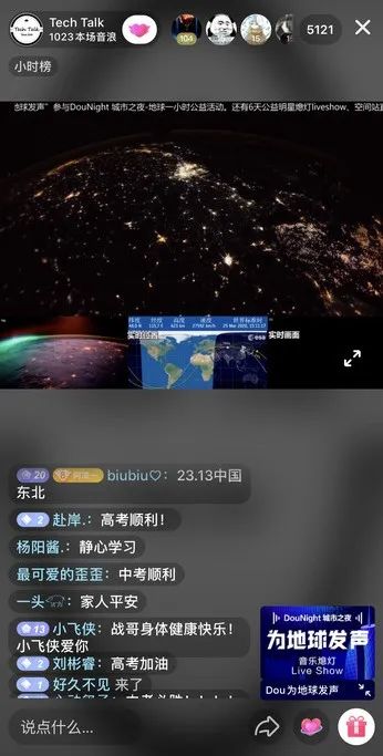 在“现场导览+知识科普+抖音直播间”的基础上,@tech talk还将直播间“搬”到ISS国际空间站。看到蔚蓝星球的观众大开眼界,感叹“这辈子居然能亲眼看到地球”,抖音希望给用户留下美好观感的同时,能够号召更多人关注可持续生活方式,为地球发声。