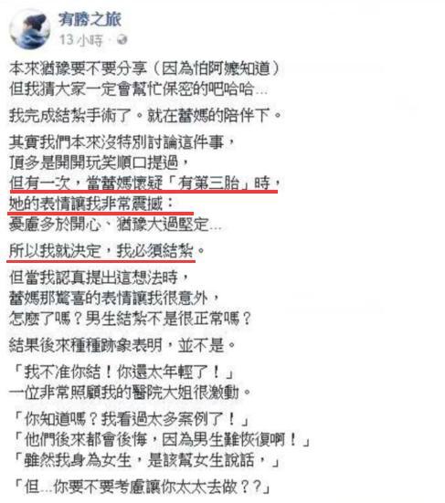 王宥胜也在社交平台上分享了自己做手术的过程,他称自己这样做是不想让妻子再遭受怀孕的痛苦。