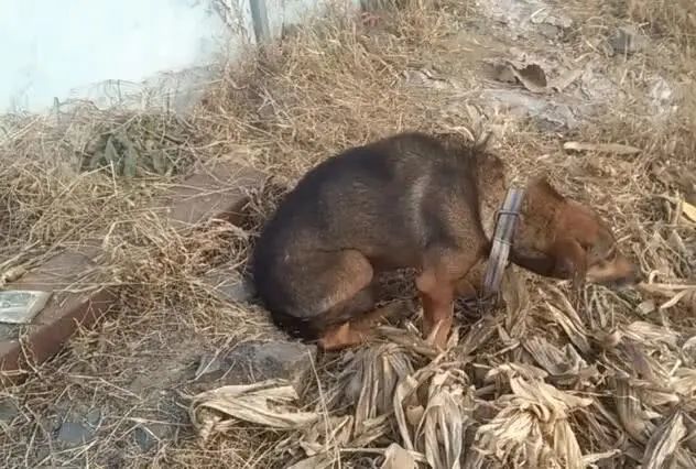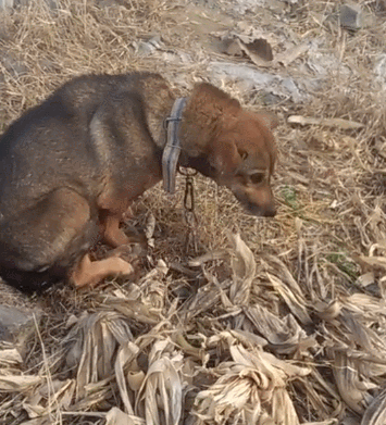 好心人觉得这只狗狗太可怜了,说服主人将他的铁链解开,铁链解开之后,狗狗还是在原地,不肯走了。因为他已经走不动啦,也可能是常年被拴着,已经不知道跑了。