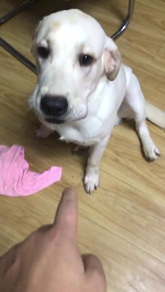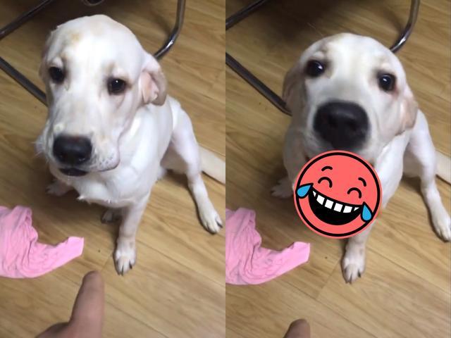 主人见状就问它:你是在找鼻子吗?并要求狗狗快点吐出来。作贼心虚的狗狗一开始还不太情愿,在主人的坚持下还是只好乖乖交出口中的赃物投降!