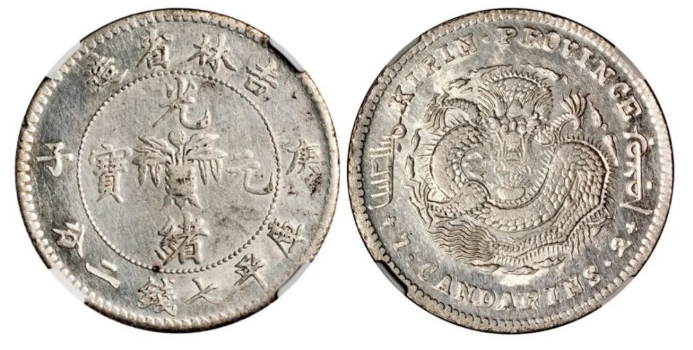 庚子吉林省造光绪元宝中心花篮库平七钱二分银币/NGC-ACAB MS62