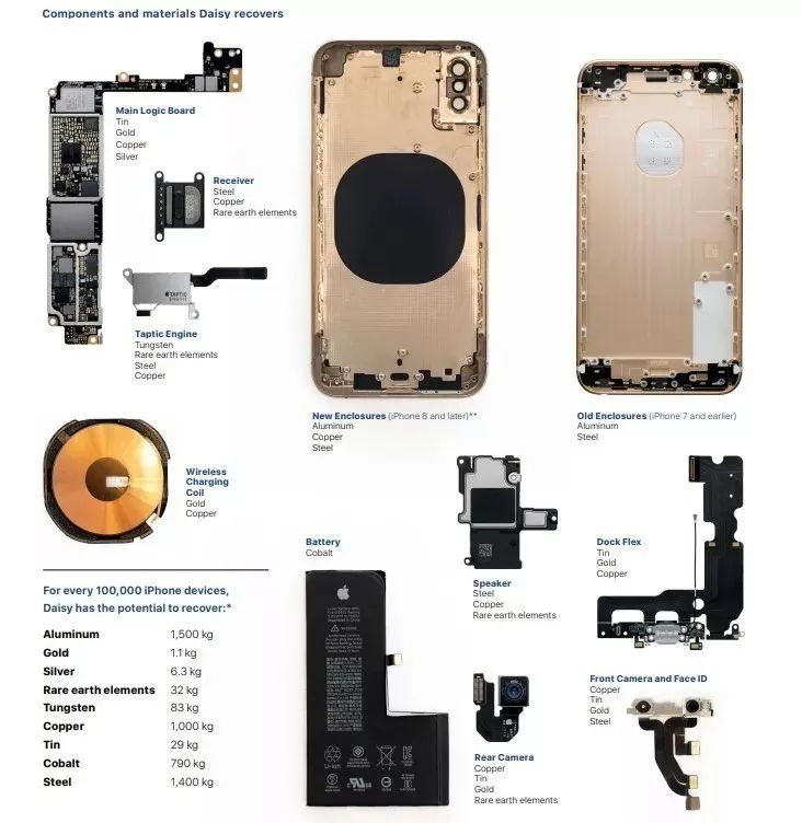 每10万台旧iPhone手机,可以提取出1.5吨铝、1.4吨铁、32公斤稀土金属(钇、镧、铽、钕、钆、镨等)、6.3公斤银、1.1公斤黄金……