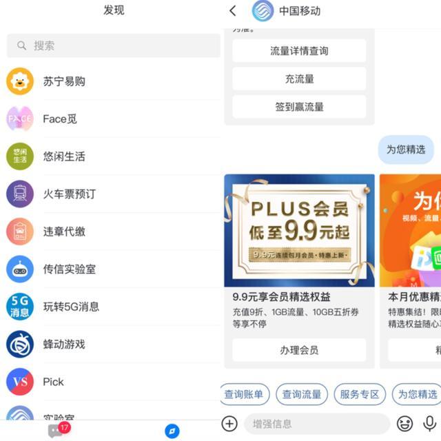 而在“发现”内,可以显示一些生活中所需要的互联网服务商,以通讯录的形式排列。用户可以直接点开相对应的服务商进行线上服务,例如可以在上面通过中国移动轻应用查话费、充流量等,类似于微信公众号。
