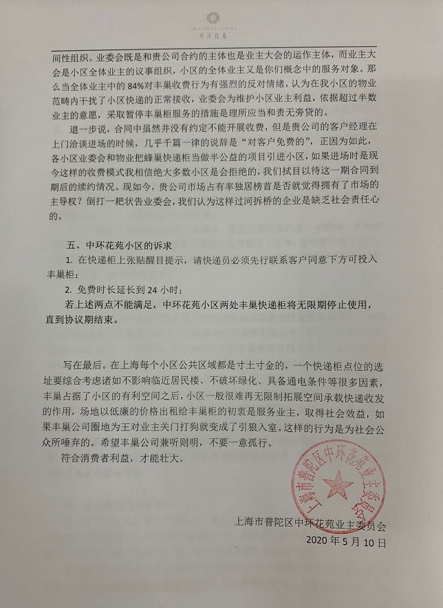 5月10日上午,上海首家因丰巢超时收费而停用的小区中环花苑发出致丰巢的公开信。