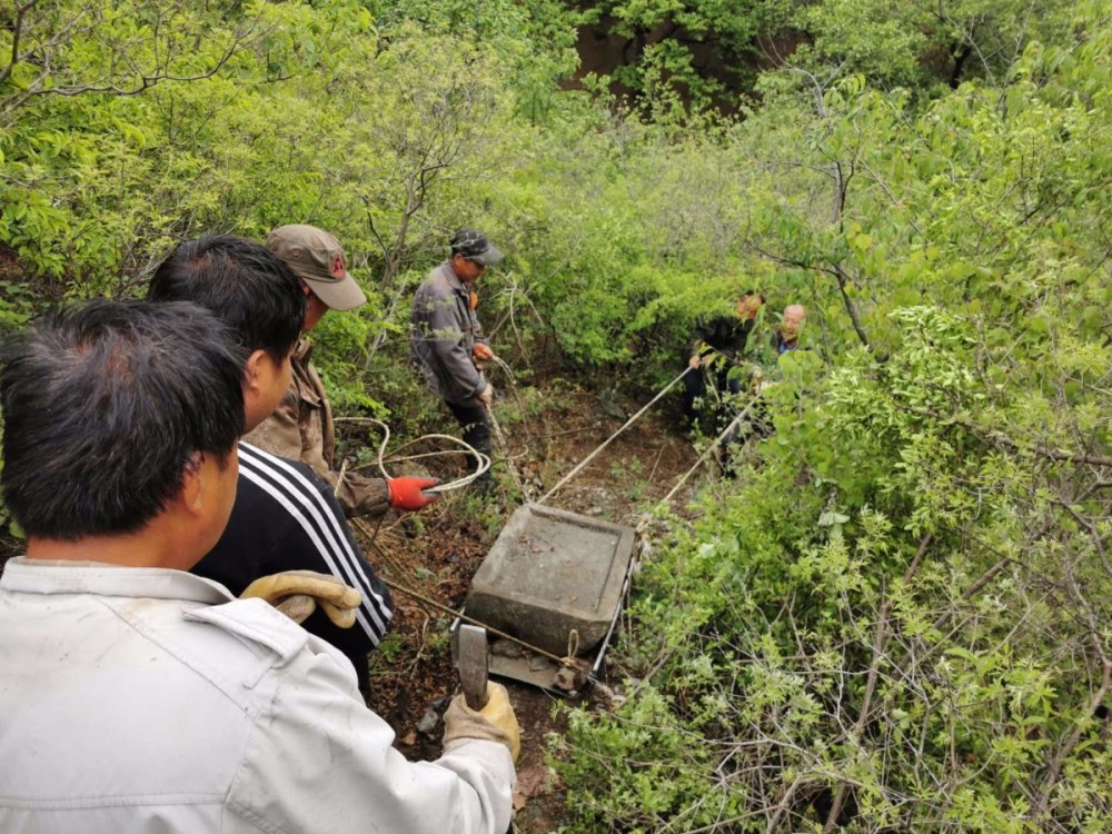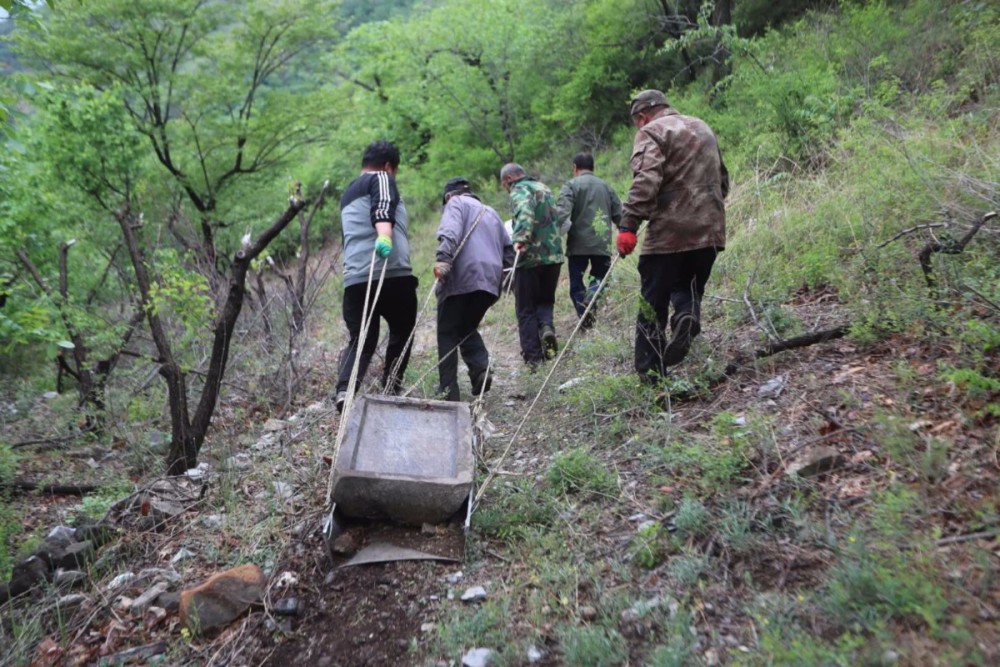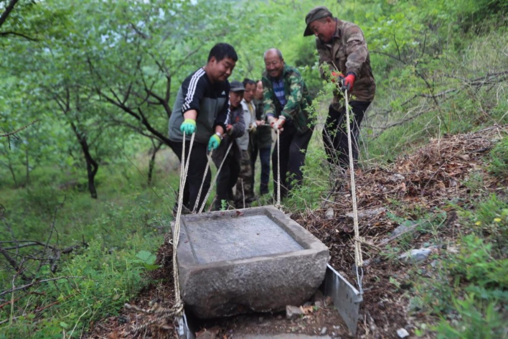 5月9日,怀柔区文物所挑选经验丰富的工人,组成7人搬运小组,还专门为石碑“量体裁衣”焊制了“铁板车”,早上7点就开始上山“打道”,在陡峭的山体上沿着水道平整出一条小路,7个人有的负责在前面拖拽并掌握方向,有的在两侧用长撬保护防止侧翻,有的在后面拖拽控制节奏,前后花了近3个小时,终于把石碑安全运到山脚下。