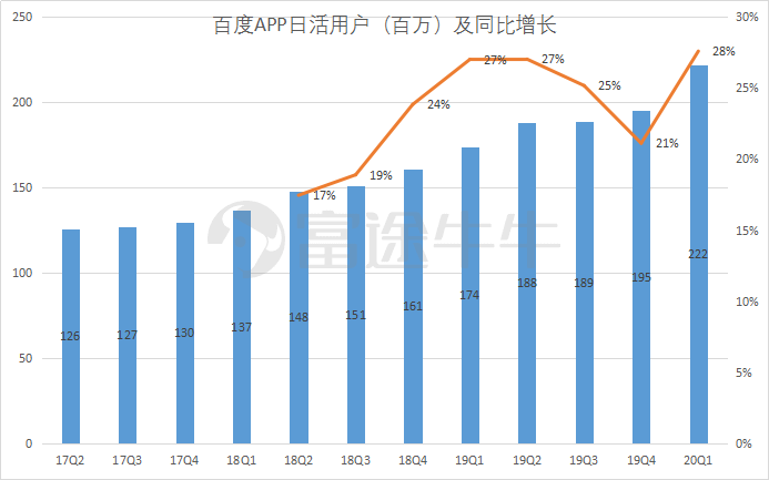 3月,百度App日活跃用户数达到2.22亿,同比增长28%;App端内搜索量同比增长45%,信息流用户时长同比增长51%,用户行为从浏览器搜索转向基于人工智能的App内搜索。