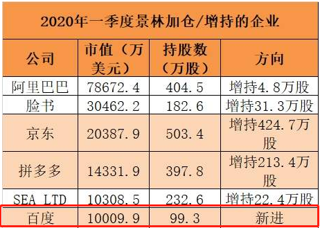 阳光底下无新事,百度在移动生态上的加码正逐渐取得效果,疫情对行业来说是一个小插曲,疫情之后的复苏已经确立,对投资者来说,这个时候的百度是具有足够安全边际的,所以,景林新进百度100万股,看上的应该也是这点。
