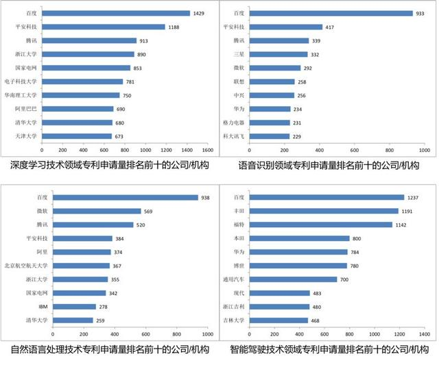 百度、腾讯、微软、浪潮、华为专利申请数量名列前五,其中百度以明显优势夺得第一。