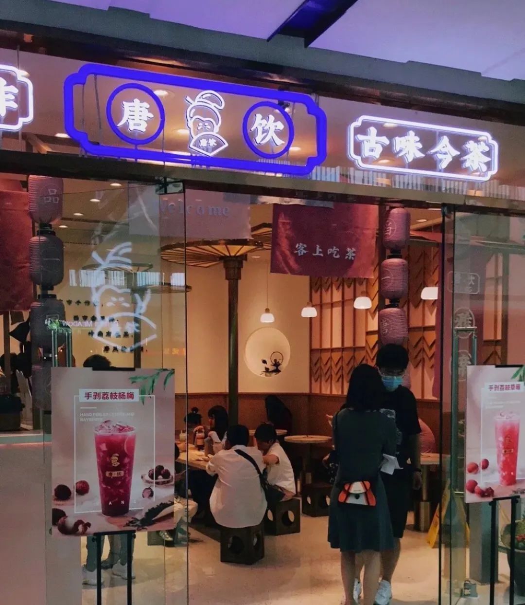 这个品牌取名唐饮,空间主打中国风,设计展现唐朝元素,产品上直接定位荔枝饮品。从产品到定位全系列发力,既塑造差异化,也通过一款相对小众的产品从供应链打造壁垒。