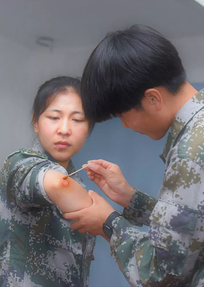 ▲战友帮程园园用碘伏擦拭磨破皮的右肘伤口。