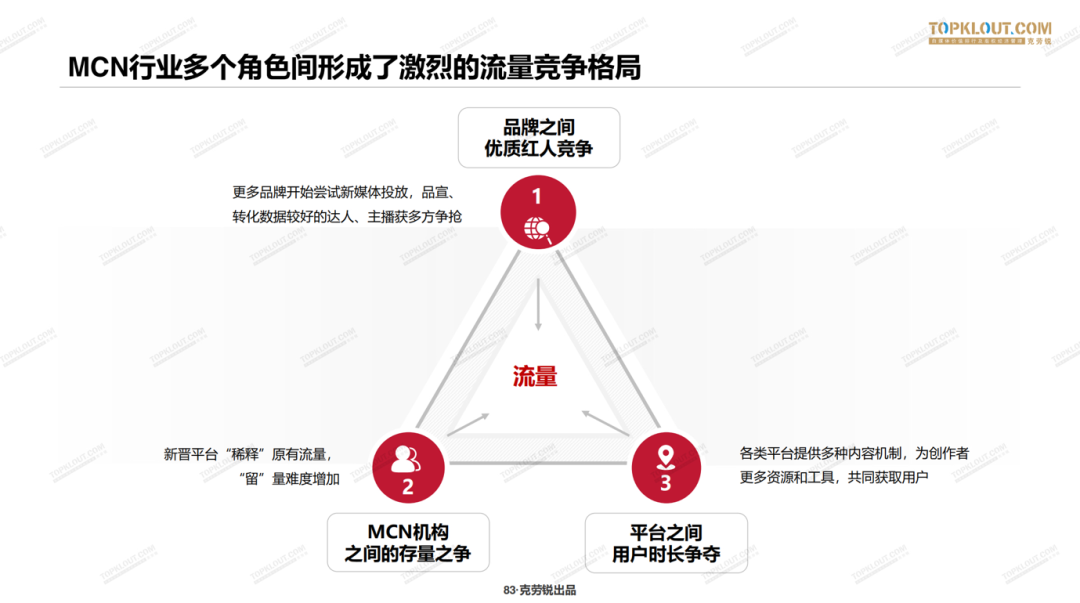 通过大量走访,克劳锐发现,从红人、MCN,到平台之间,都有着激烈的竞争格局。网络红人、主播争抢品牌投放资源;在新媒体平台之间,同样需要争夺用户时长,提高粘性,来获取更多用户。