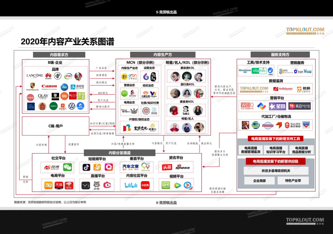 由MCN、明星名人、KOL组成的内容生产方,通过包括社交、电商、资讯、短视频等平台组成的内容分发渠道,再由可提供数据监测、营销服务、技术支持的服务方进行包装,最终传递到B端企业和C端用户组成的内容需求方,一个成熟的产业闭环已经完成。