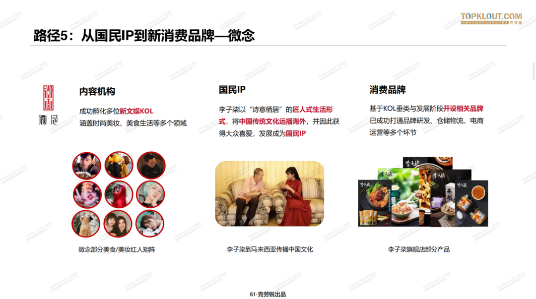 李子柒所属的微念,从国民IP,发展到现在,已是一家基于时尚、美食等垂类开发的新消费品牌。通过把IP打造成品牌,研发出螺蛳粉、牛肉酱、咸鸭蛋等与IP背景相匹配的产品,跑通了“IP+电商”的商业模式。